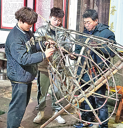 “2018年,我第一次担任‘鱼头’,拜访了不少村里的老人,了解鱼灯的历史文化。”汪文泉介绍,嬉鱼灯有着相对固定的流程和线路,“活动开始前,我会把路线来来回回跑好几遍。”扎制鱼灯是门细活,以竹为骨,用纸糊成,腹内点烛……每回,汪文泉都跟着老师傅耐心看、仔细学,“传统技艺不能在我们这一代手中失传了。”